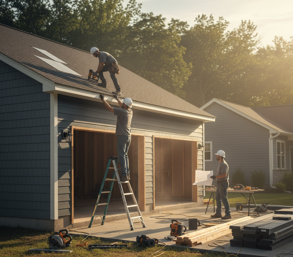 Installation of garage door 16 feet x7 feet, Back door 32 x80 and Back Windows 36 x 36. With a finished height of 12 feet.